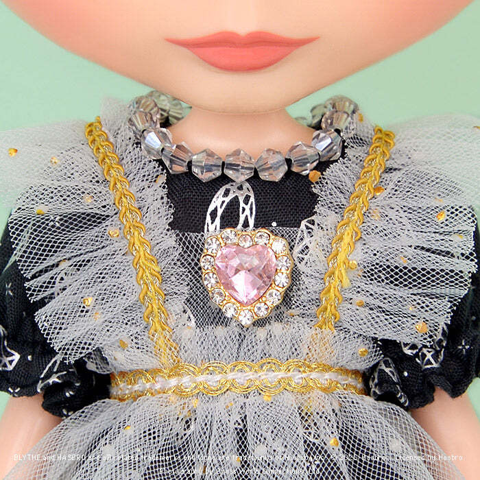 胸元のハートのビジューがかわいいチュールエプロンは、ゴールドのドットが付いた生地を使用しています。
