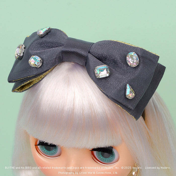 ヘアバンドは二種類の生地を重ねてリボンにし、大粒のビジューをあしらってゴージャスに仕上げました。