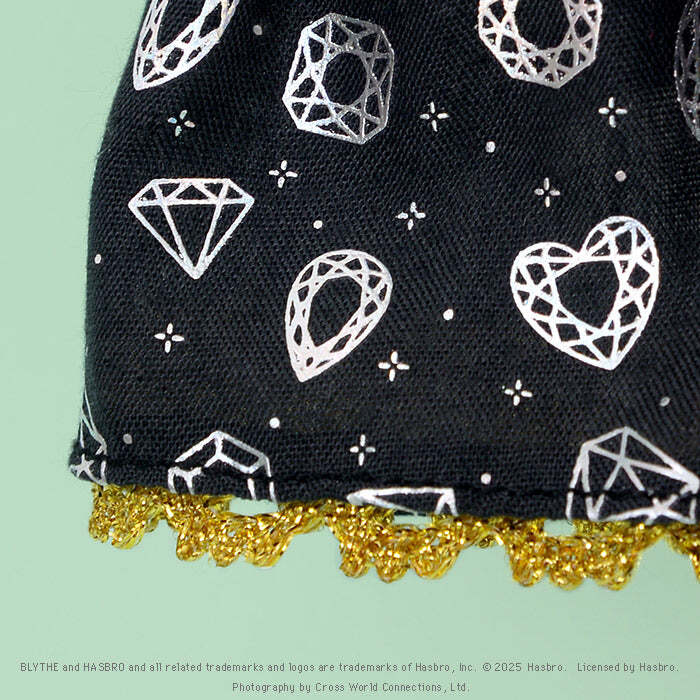 ワンピースのビジューのイラストは、オーロラ箔でプリントすることによってきらめきを生み、さまざまな宝石を思わせます。また、スカートがふんわりと自然に広がるようにチュールのインナーを重ねています。